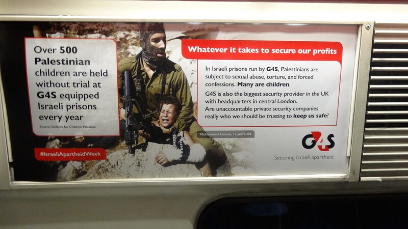 Londra metrosundaki İsrail Apartheid Haftası posteri – İsrail Hapishane sistemi tedarikçisi G4S şirketine boykot çağrısı